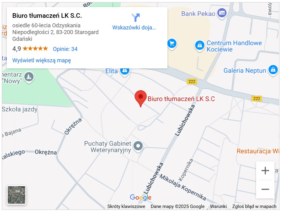 Administratorem Państwa danych osobowych jest Biuro Tłumaczeń LK Lucyna Kosecka Runge, Os. 60-Lecia ONP 2/17, 83-200 Starogard Gdański